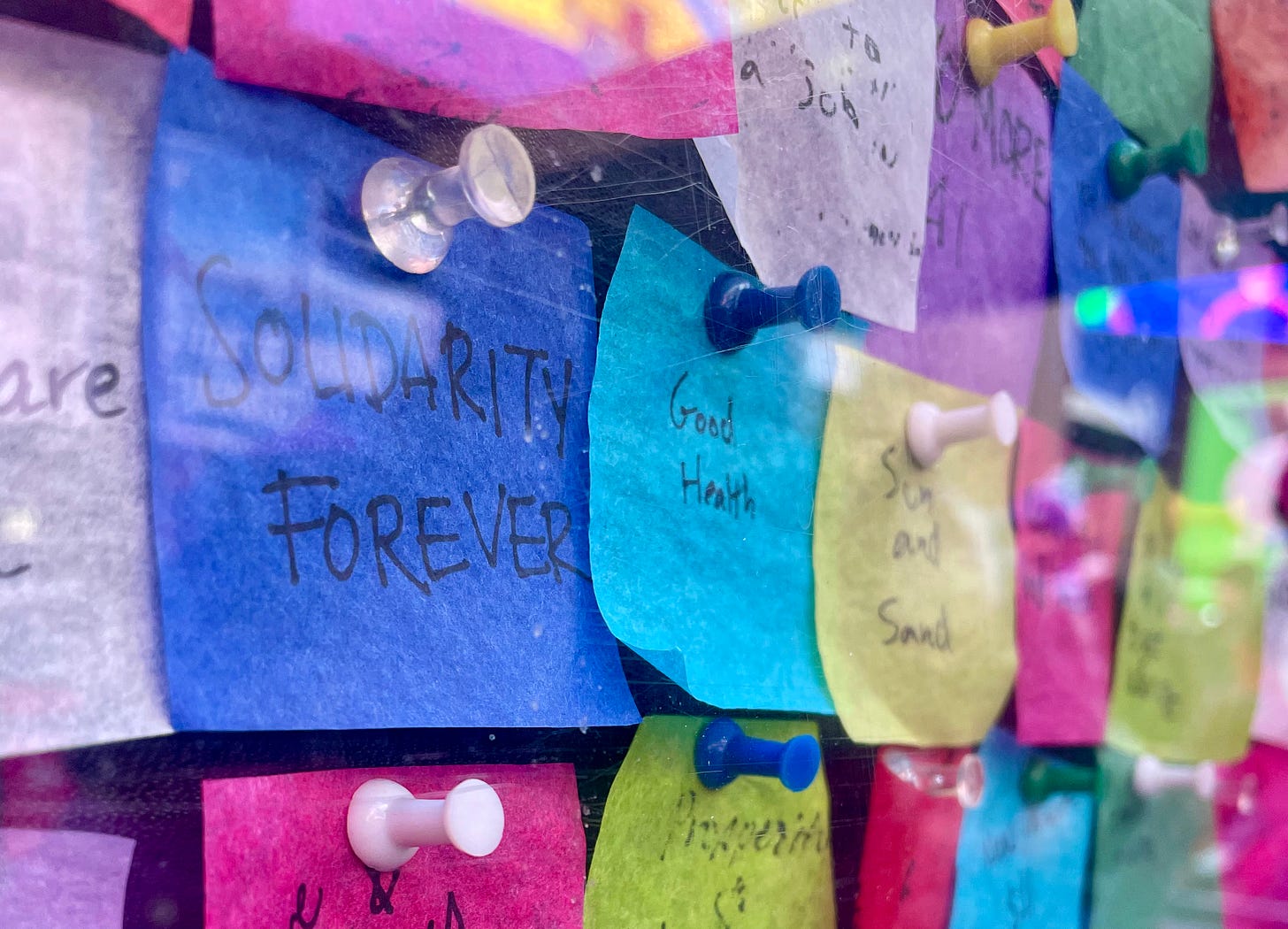 When the ball drops at midnight on New Year’s Eve, over a ton of confetti will fall. Some squares carry handwritten wishes from visitors to Times Square. Above is a recent photo I took of some of this year’s wishes: